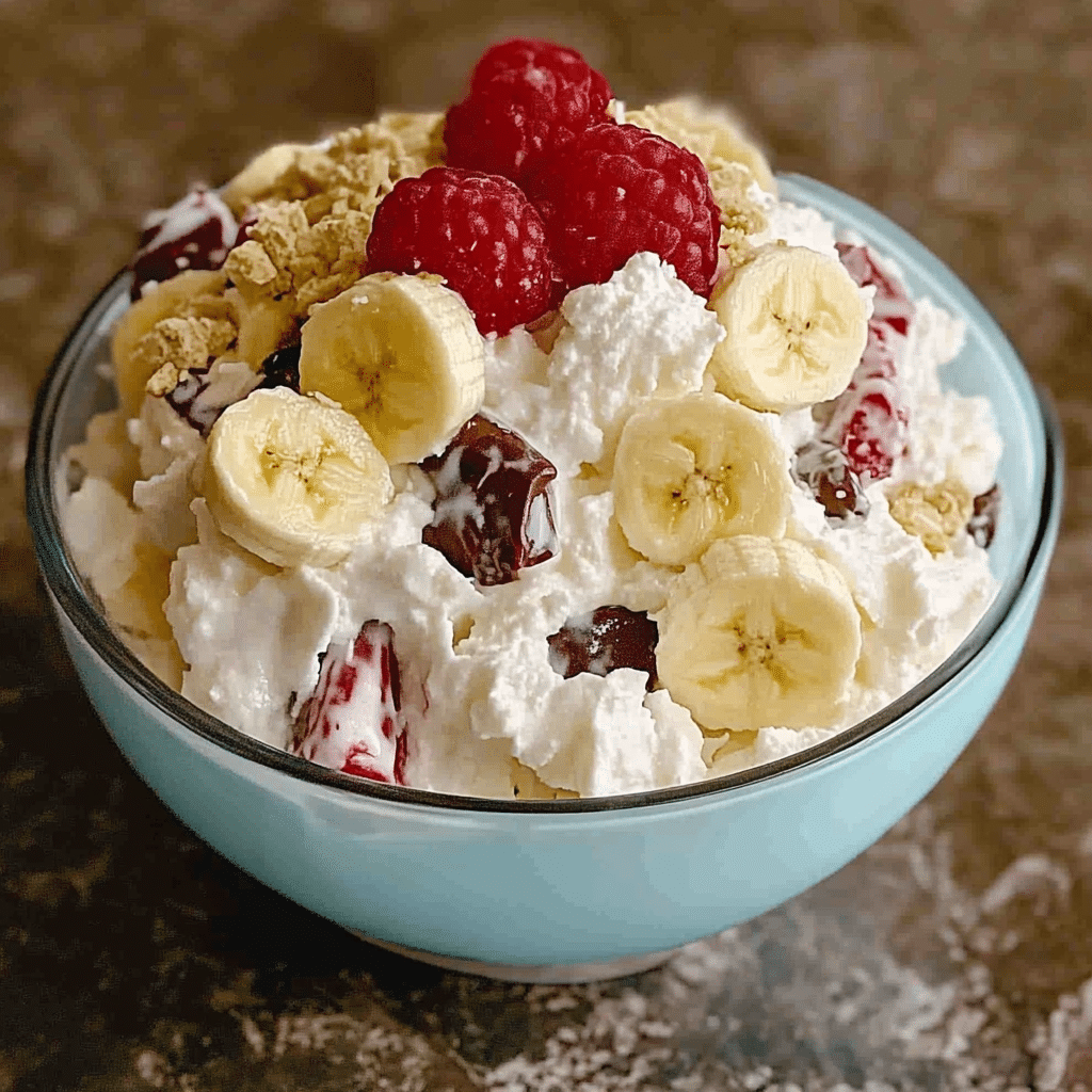 A fun, fruity, and creamy dessert salad inspired by the classic banana split. This no-bake treat is packed with bananas, pineapple, cherries, marshmallows, and a luscious whipped cream dressing. Perfect for potlucks, picnics, or family gatherings.