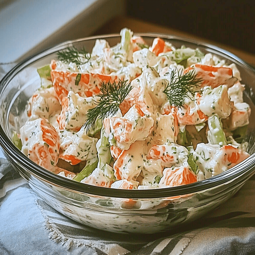 A light, refreshing salad made with tender crab meat, crunchy vegetables, and a creamy dressing. Perfect as a side dish, a light lunch, or a filling for sandwiches and wraps.