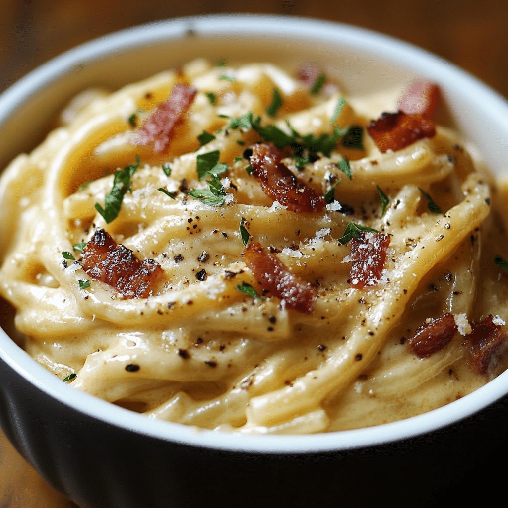 A rich and creamy twist on the classic Italian carbonara, this dish features tender chicken, crispy bacon, and spaghetti tossed in a velvety Parmesan cream sauce.