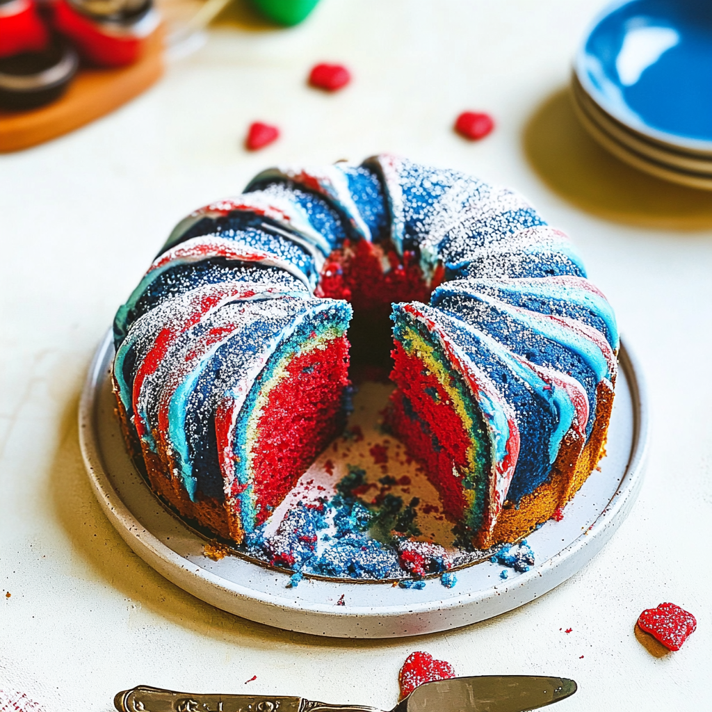 Red, White & Blue Marble Cake is a festive and colorful dessert featuring swirls of vibrant red and blue vanilla cake, perfect for patriotic holidays like the 4th of July.