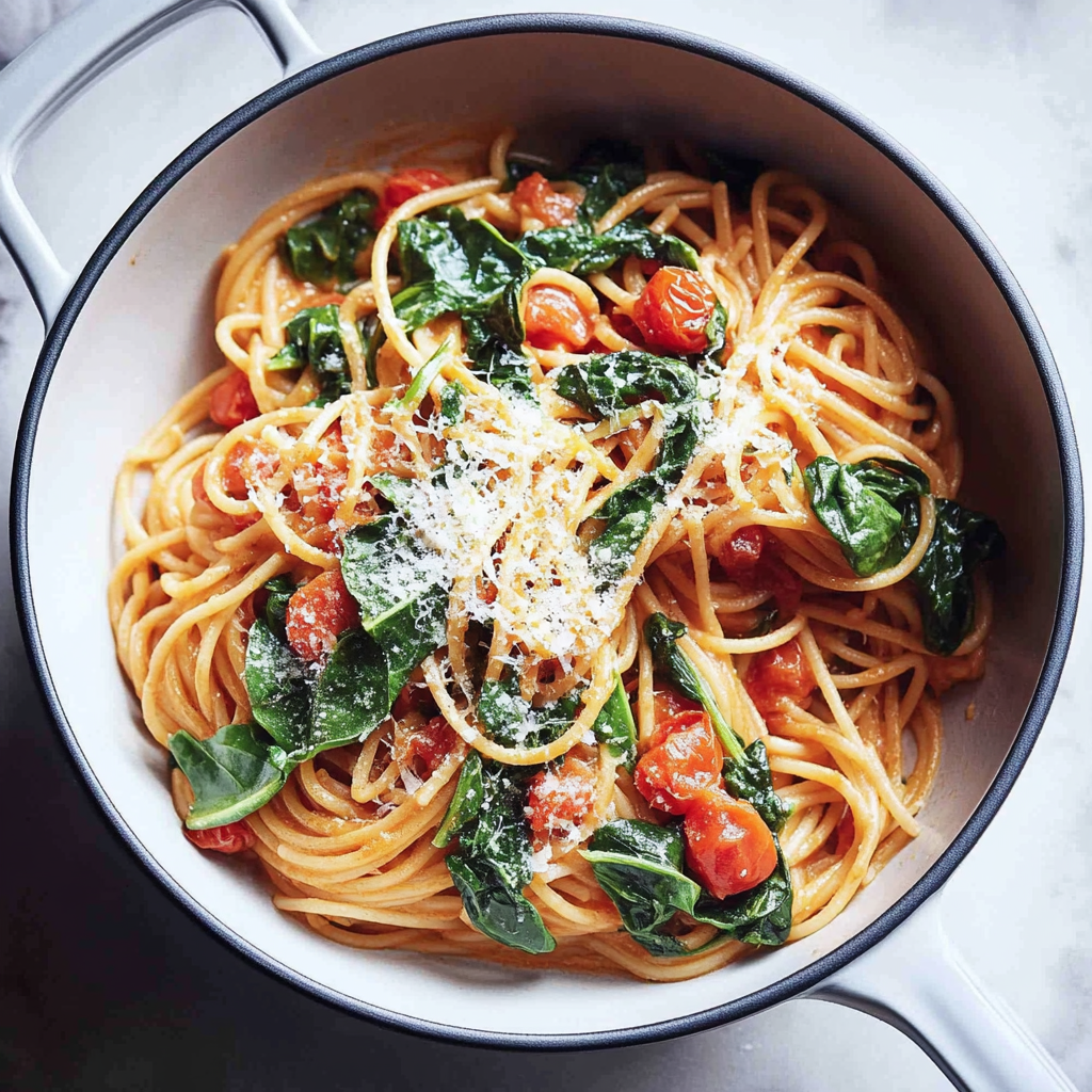 Tomato Spinach One Pot Pasta is a quick and easy dish made with simple ingredients like tomatoes, spinach, pasta, and garlic—all cooked in one pot for a hassle-free, delicious meal.